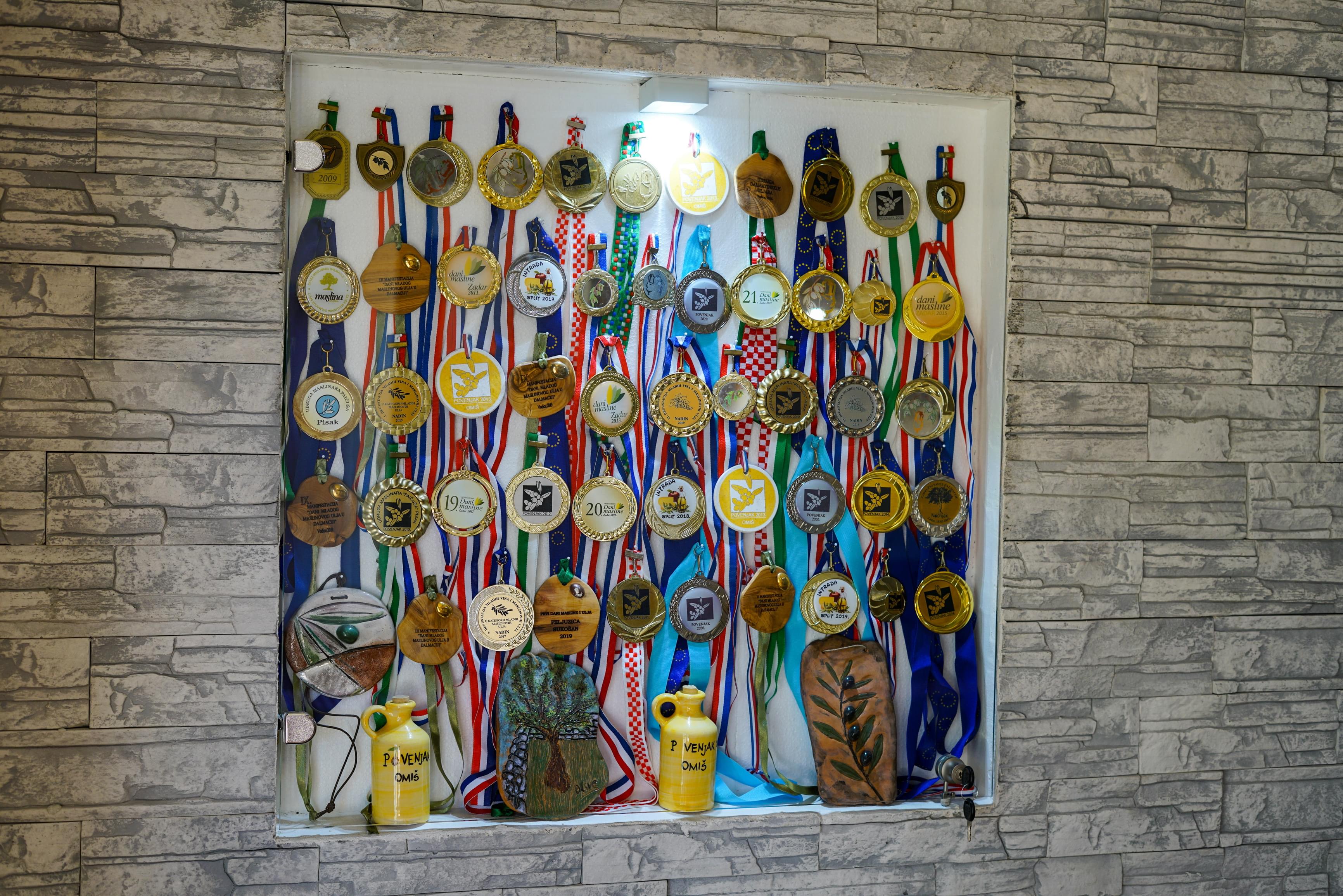 Nagrade koje ne prestaju krasiti vitrine našeg obiteljskog gospodarstva već preko 15 g. u nizu, a ukupno preko 70 medalja i pehara (od toga preko 50 zlatnih odličja), snažna su potvrda da ono što radimo u maslinarstvu jest ispravan put u skladu s najvišim standardima kvalitete. Međunarodne manifestacije po cijeloj Hrvatskoj i van nje, naša su redovna stanica u nastojanju da ispravno, analitički i na više adresa validiramo kako su svojstva naših ulja konstantno najviše kvalitete i kako ulaganja u pogone i tehnike pokazuju konkretan povrat.